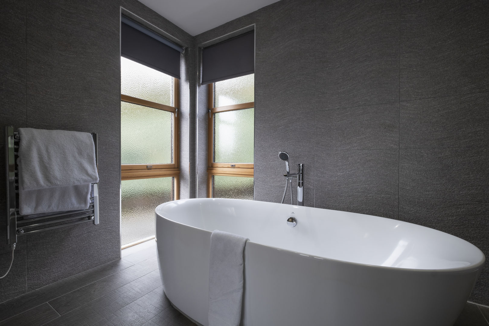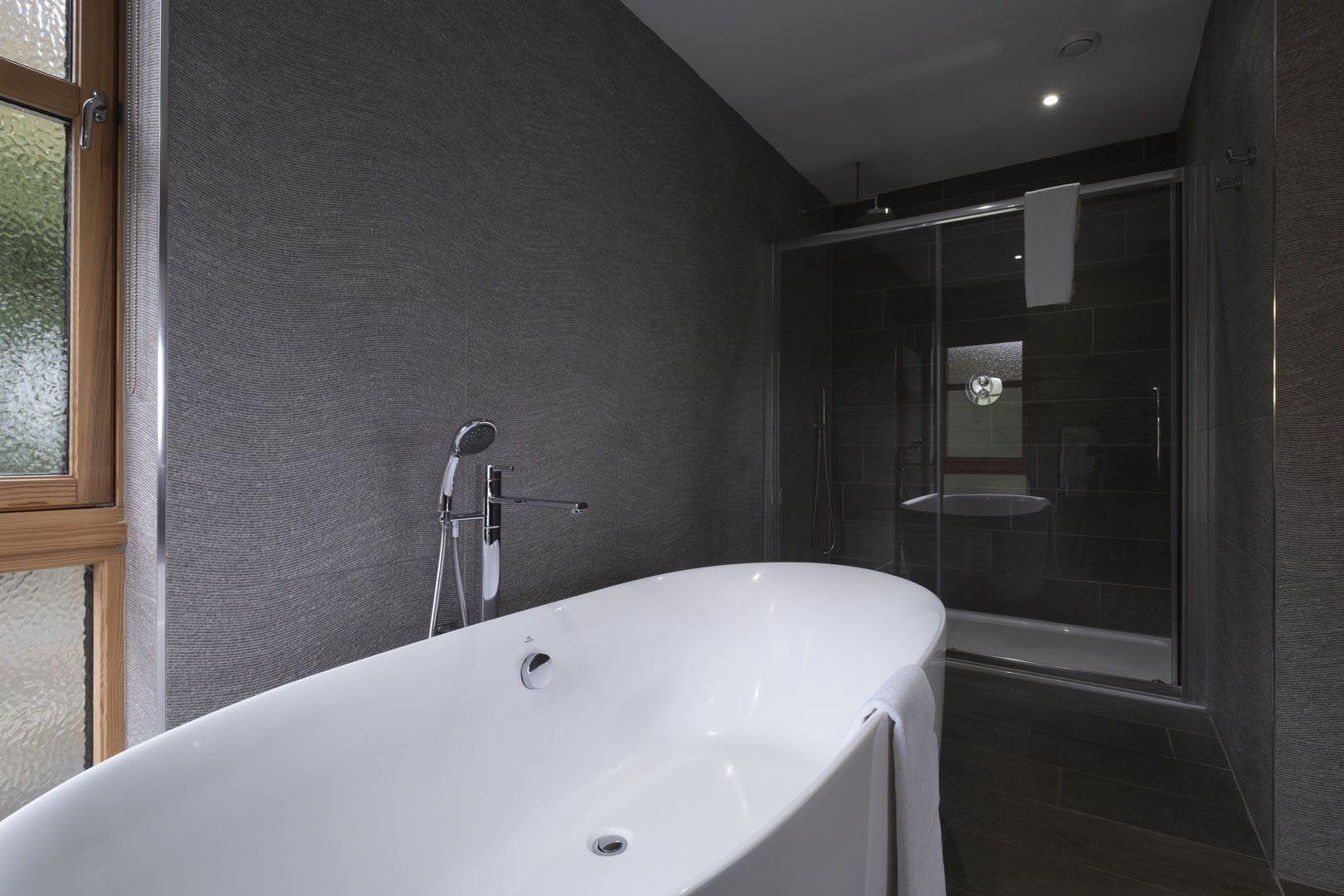 The living/lounge space has a comfortable corner sofa and armchair with floor to ceiling units housing the 42 inch TV with Sky Satellite Channels,  cosy carpets and soft furnishings in Heathers and greys provide a luxurious feel and connection with the outside landscape.  There are little luxuries to enjoy like our complimentary bathrobes and built in straighteners/hairdryer.  Both bedrooms have double beds and wall mounted LCD televisions.